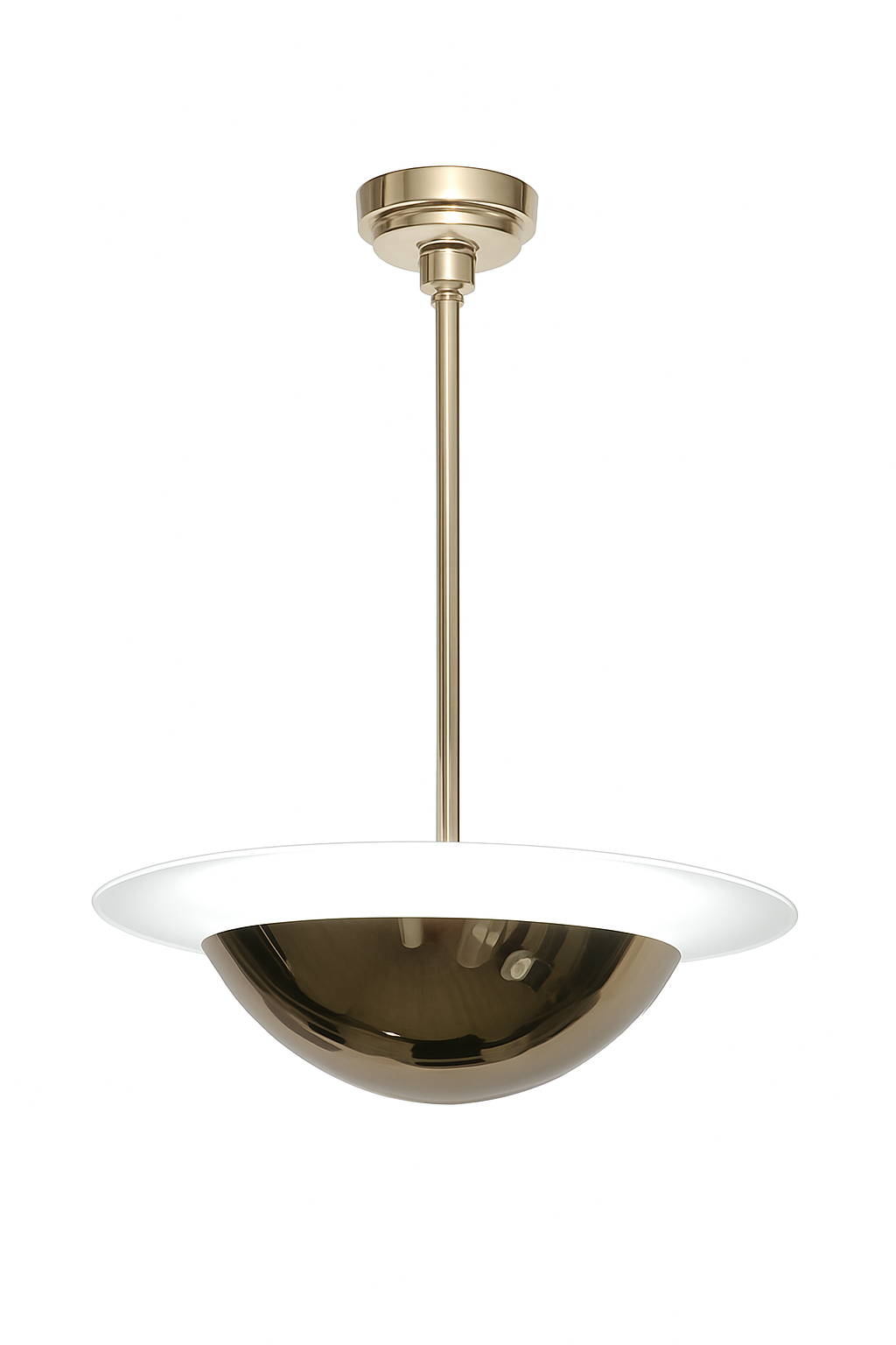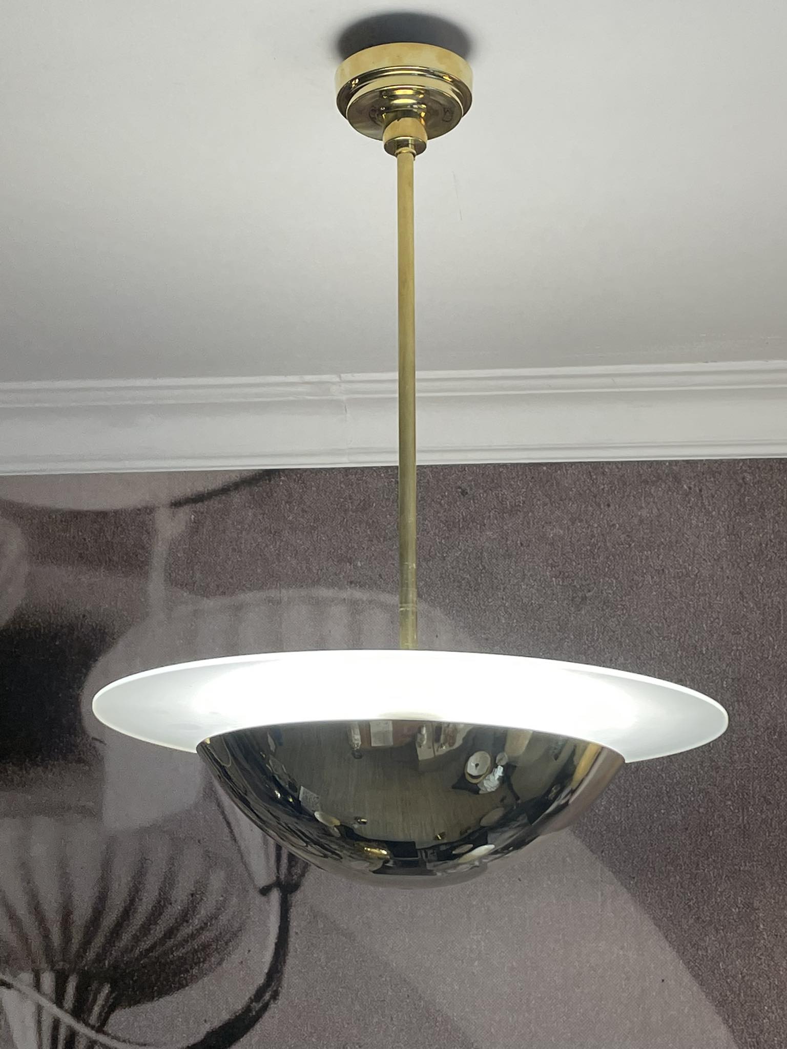 Schlichte Pendelleuchte von stiller, klassischer Eleganz – unaufdringlich und auf Dauer angelegt. Im Geist des Art Déco komponiert: eine flache Messingschale (Ø 30 cm), darüber eine runde, mattierte Glasplatte (Ø 45 cm), verbunden durch ein solides Messingrohr und an der Decke mit einem gestuften Deckenbaldachin sauber abgeschlossen. So entsteht eine klare, in sich stimmige Form mit ausgewogenen Proportionen. Die weit auslaufende Schale lenkt das Licht des LED-Moduls (18 W) nach oben; die Glasplatte nimmt es auf und gibt es diffus in den Raum zurück – Das Ergebnis ist eine gleichmäßige, blendfreie Grundhelligkeit mit dezenten Reflexionen auf poliertem Berliner Messing. Sorgfältig gefertigt, zielt dieses Lichtobjekt nicht auf schnellen Wechsel, sondern darauf, Generationen zu überdauern und seinem Besitzer über viele Jahre treue Dienste zu leisten. Die zurückhaltende Formensprache der 1930er-Jahre macht es zur stimmigen Wahl für private Interieurs wie auch für repräsentative Bereiche.