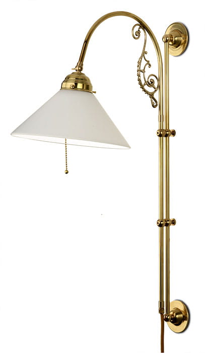 Die Wandleuchte im Stil der Jahrhundertwende wird aufwendig und hochwertig verarbeitet in traditioneller Handwerksqualität. Verwendet werden nur klassische Materialien wie reines Messing und hochwertiges Opalglas. Die Bogen-Wandleuchte ist um ihre eigene, horizontale Achse rotieren, der Auslegerarm kann aber auch in der Höhe verstellt werden, so lässt das Licht auf einen bestimmten Bereich fixieren, während der Schirm ansonsten für eine angenehm blendfreie Abstrahlung sorgt. Der Höhenvestellbereich liegt bei ca. 40 cm und verläuft über das innere, vertikale Messingrohr, die an einer Wand montiert wird. In den Bogenarm ist eine raffinierte Jugendstil Verzierung eingefasst, das angehängte Lampenschirm aus weißem Überfangglas setzt genau die richtigen Lichtakzente. Bei Bedarf kann das Glas per Kugelgelenk mit Messing-Stellschraube am Schirmhalter vertikal verstellt werden kann, zum Ein- und Ausschalten dient ein Zugkettchen aus Messingperlen. Der Lampenschirm aus einer namhaften Glashütte, ist in alter Tradition mit Überfangtechnik auch in der alten Originalform, mundgeblasen. Die Leuchte ist mit einem historisch-klassischen Textilkabel versehen. Die Textilkabel sind den Originalen nachempfunden und entsprechen dem VDE-Vorschriften. Die Leuchte passt sich hervorragend nahezu jedem Einrichtungsstil, sowohl in privaten, als auch in historischen, öffentlichen, repräsentativen Räumlichkeiten an.